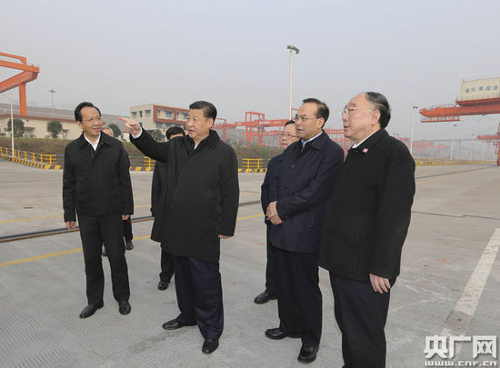央廣網(wǎng)重慶1月5日消息 習(xí)近平總書記4日下午來到重慶果園港考察,聽取長江上游航運(yùn)中心建設(shè)、鐵路公路水路聯(lián)運(yùn)等情況介紹,察看正在作業(yè)的集裝箱船。聽說渝新歐國際鐵路沿線國家實(shí)現(xiàn)一次報(bào)關(guān)查驗(yàn)、全線放行,他贊賞“挺好”??吹礁劭谠O(shè)施齊備,已初具規(guī)模,他說:“這里大有希望。”